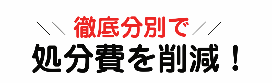 ゴミの排出を削減当社では多くの廃棄物のリサイクル業者と提携しております。回収した不用品は徹底的に仕分け分別し、約80%のリサイクル率を誇っております。ゴミを削減し、お客様がお支払いする処分費用を抑えて安い不用品業者として精進してまいります。